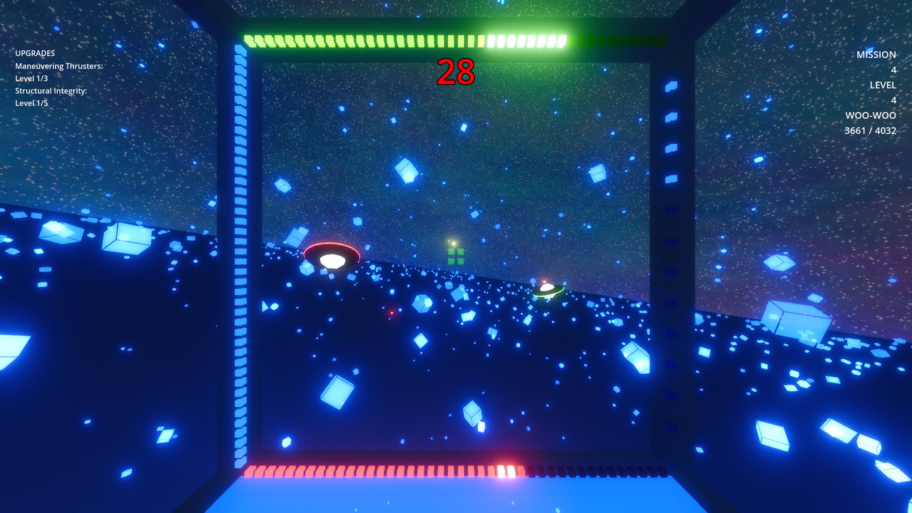 I also added a collision sound for the saucers, and allowed them to do a nominal amount of damage if they hit you. This doesn’t happen very often, but it always felt weird not to have any visual or auditory feedback when it did.